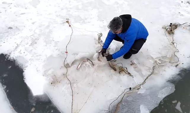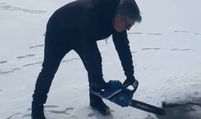 Donan gölette buzu motorlu testereyle keserek balık avladılar