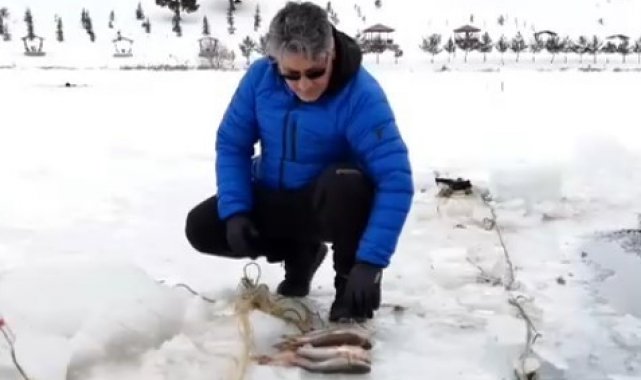 Gümüşhane'nin Kelkit ilçesindeki 1800 rakımlı Ernek Yaylası'nda vatandaşlar donan gölette buzları motorlu testereyle keserek balık avladı.