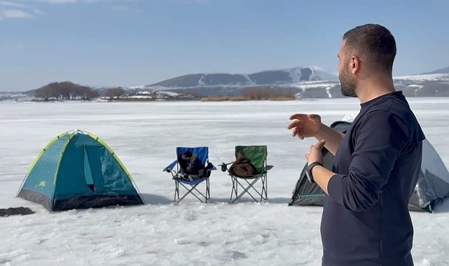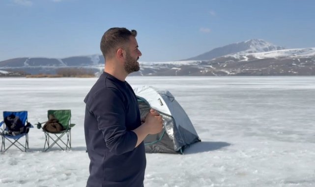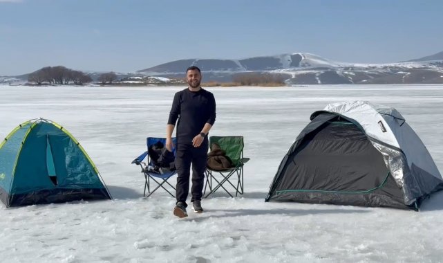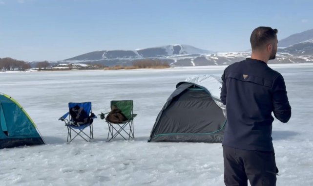 Bitlis'in Ahlat ilçesinde soğuk hava nedeniyle donan Nazik Gölü'nü kampçılar mesken tuttu.