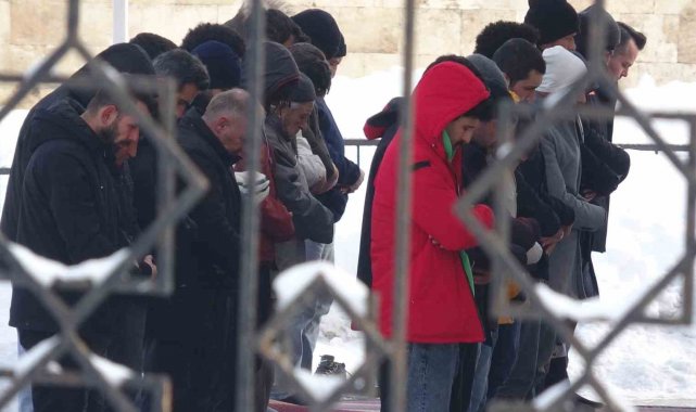 Sivas'ta Cuma namazında camiye sığmayan cemaat, sıfırın altında 10 derece dondurucu soğuğa aldırış etmeden namazlarını açık alanda kıldılar.