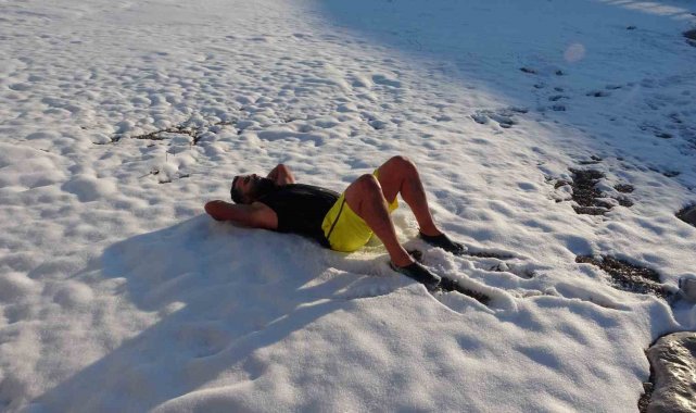 Hava sıcaklığının eksi 9 dereceye kadar düştüğü Van'da 2 öğretmen, Van Gölü'nün soğuk sularına girerek yüzdükten sonra kar üstünde güneşlendi.