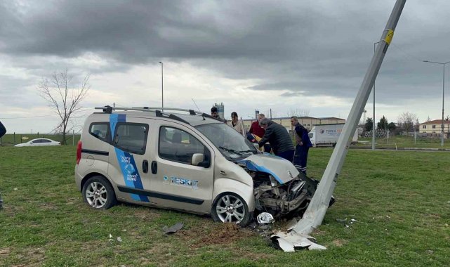 Tekirdağ Çorlu'da sürücüsünün direksiyon hakimiyetini kaybettiği hafif ticari araç, dönel kavşakta aydınlatma direğine çarptı. Yaralanan sürücü hastaneye kaldırıldı.