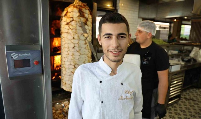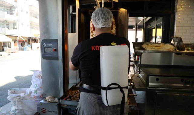 Adana'da hava sıcaklıkları 40 dereceyi aşınca ocak başında çalışan döner ustaları, sırt ve göğüslerine kalıp buz koyarak çalışmaya başladı.