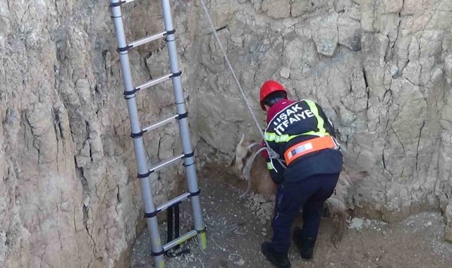 İhbar üzerine olay yerine giden Uşak Belediyesi İtfaiye ekipleri, keçinin düştüğü çukura merdiven ve güvenlik ip ile indi.
