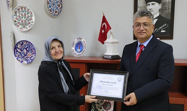 DPÜ Rektörü Kızıltoprak'tan, 72 yaşındaki MYO Mezunu Selma Şahin'e onur belgesi