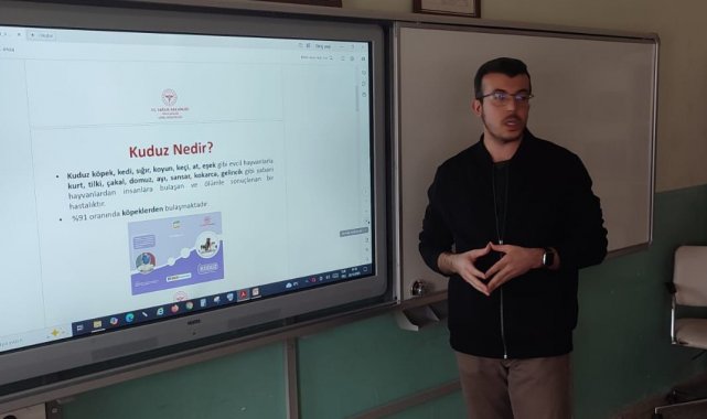 Dr. Emirhan Akkaya, Hamit Kaplan Ortaokulu ve Adil Candemir Anadolu Lisesi öğrencilerine yönelik gerçekleştirdiği eğitimde, kuduz hastalığının tanımı, bulaşma yolları, korunma yöntemleri ile erken müdahalenin önemi hakkında bilgi verdi.