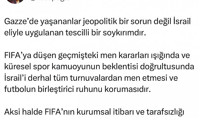 Dr. Kasapoğlu, sosyal medya hesabından yaptığı açıklamada, "Gazze'de yaşananlar jeopolitik bir sorun değil İsrail eliyle uygulanan tescilli bir soykırımdır. FIFA'ya düşen geçmişteki men kararları ışığında ve küresel spor kamuoyunun beklentisi doğrultusunda İsrail'i derhal tüm turnuvalardan men etmesi ve futbolun birleştirici ruhunu korumasıdır. Aksi halde FIFA'nın kurumsal itibarı ve tarafsızlığı büyük yara alır" ifadelerine yer verdi.