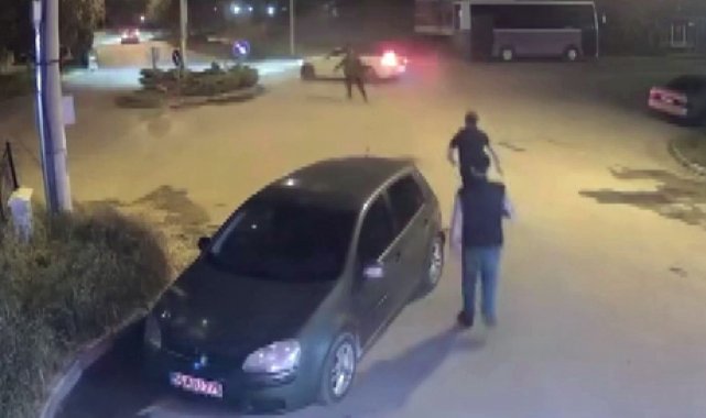 Sakarya'nın Sapanca ilçesinde bir kişinin dönel kavşakta drift yapan lüks otomobili, tabureyle kovaladığı anlar güvenlik kamerasına yansıdı.