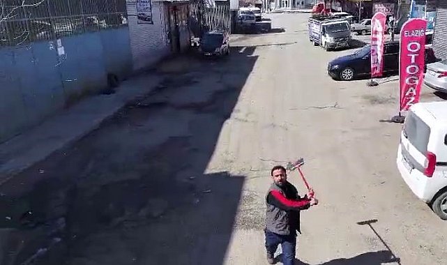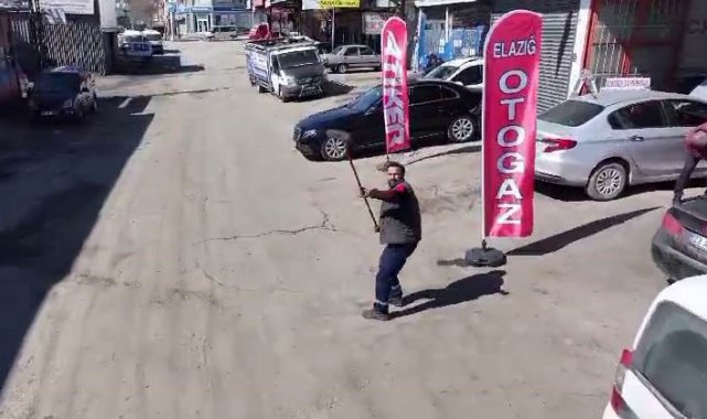 Olay Elazığ merkezde bulunan sanayi sitesi içerisindeki bir iş yerinin önünde meydana geldi. Burada dron kaldıran bir kişi, etrafı çekmeye başladı. Bu sırada dükkanın önünü temizleyen bir çalışan, dronu görünce önce panikledi. Daha sonra elindeki fırça ile dronu kovalamaya çalışan işçi, başarılı olamayınca geri döndü.