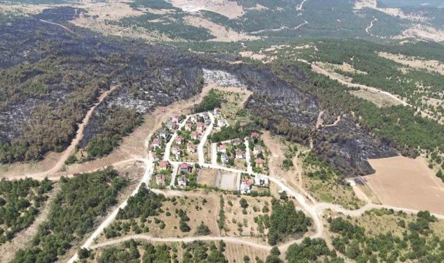 Karabük'ün merkez ilçesine bağlı Kahyalar Köyü yakınlarında çıkan orman yangını nedeniyle büyük tehlike atlatan villalar dronla görüntülendi.