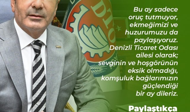 Ramazan ayının; rahmetin, bereketin, paylaşmanın ve dayanışmanın en güçlü şekilde hissedildiği müstesna bir zaman dilimi olduğunu söyleyen Denizli Ticaret Odası (DTO) Başkanı Uğur Erdoğan, bu ayın toplumsal birlik ve beraberliği pekiştirdiğini ifade etti; "Ramazanın manevi ikliminin; şehrimize, ülkemize ve tüm İslam âlemine huzur, sağlık ve bereket getirmesini diliyorum" dedi.