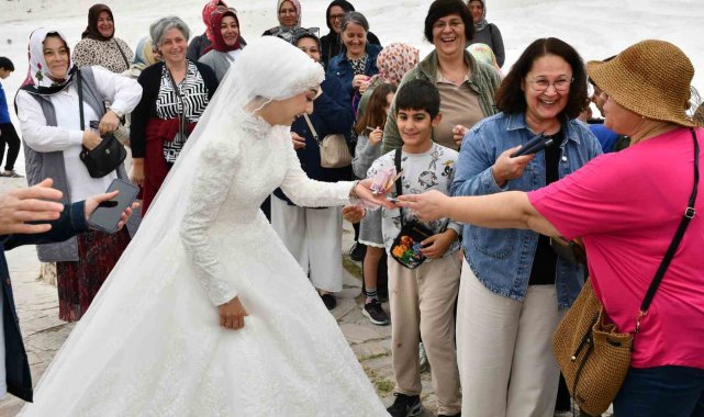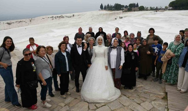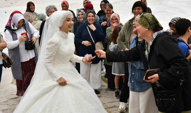 Düğün çekimi için Pamukkale travertenlerine giden çift için turistler takı kuyruğu oluşturdu