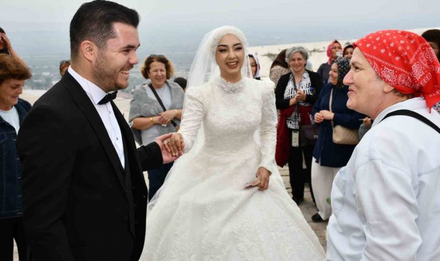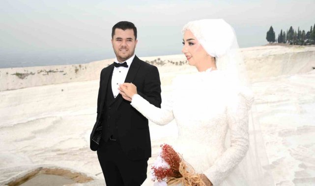 Denizli'de geçen yıl evlenen çift, düğün fotoğraflarını beğenmeyince Pamukkale travertenlerinde yeniden düğün çekimi planladı. Travertenlerde fotoğraf çekimi yaptıran çiftle sohbet eden turistlerin takı takmaları unutulmaz anlar yaşattı.