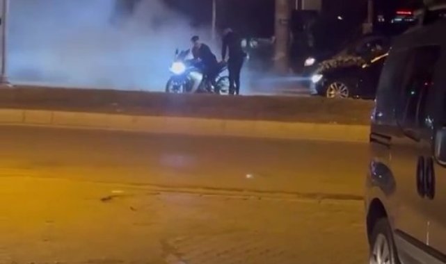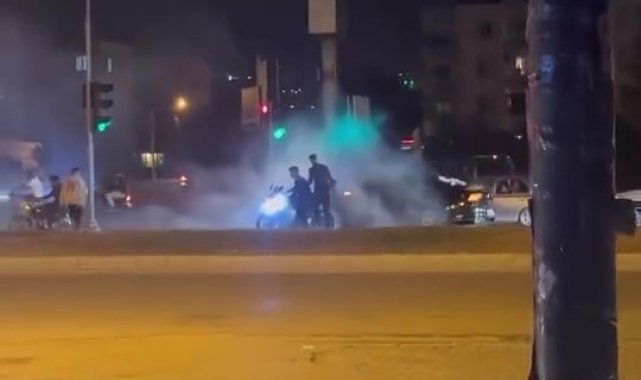 Hatay'da düğün konvoyunun önüne geçerek kırmızı ışıkta lastik yakan motosikletlinin o anları kameraya yansıdı. Kendi canını ve çevredekilerin canını hiçe sayan motosikletli kısa sürede tozu dumana kattı.