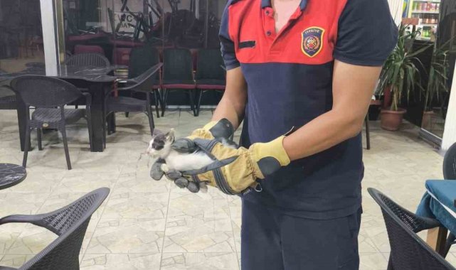 Hatay'da bir iş yerinde duvarla klima arasına sıkışan yavru kedi, işletme sahibinin duyduğu miyavlama sesiyle fark edilerek, itfaiye ekipleri tarafından kurtarıldı.