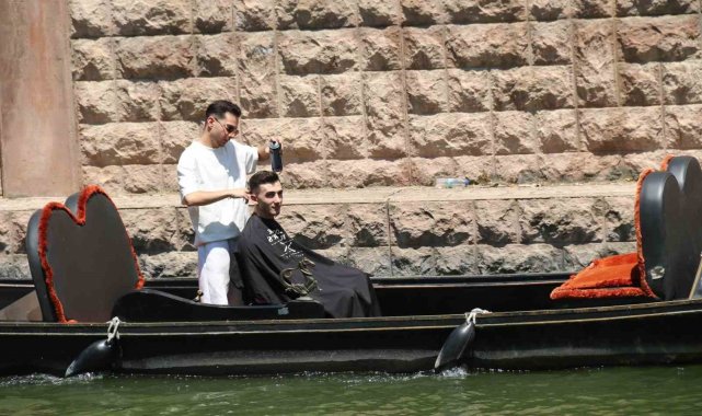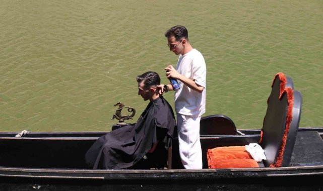 Eskişehir'de 14 yıldır erkek kuaförlüğü yapan Mehmet Düşünceler, genellikle turistlerin tercih ettiği Porsuk Çayı üzerinde yüzen gondolda müşterisinin saçını şekillendirdi. O anların videosu sosyal medyada onlarca yorum ve beğeni aldı.