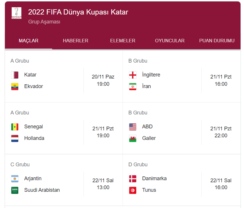 Katar'da düzenlenecek 2022 FIFA Dünya Kupası grup kura çekimi ile maç tarihleri belli oldu. Dünya Kupası maçları, 20 Kasım - 18 Aralık 2022 tarihleri arasında düzenlenecek. Grup maçları 20 Kasım ile 2 Aralık tarihlerinde oynandıktan sonra 18 Aralık'a kadar eleme maçları ile devam edecek.