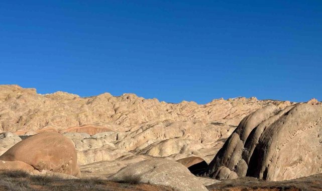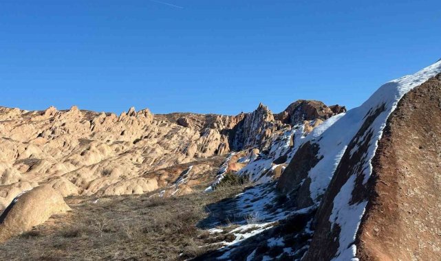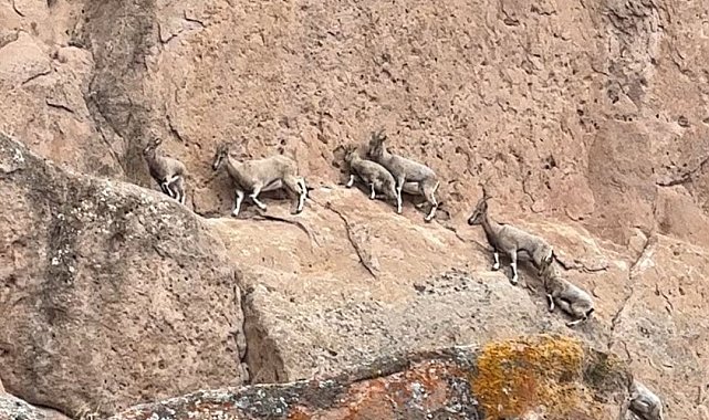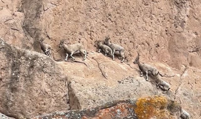 Sivas'ta rengi ve yapısıyla Mars gezegenine benzetilen Eğribucak kayalıklarında nesli tükenme tehlikesi altında olan dağ keçisi sürüsü görüntülendi.