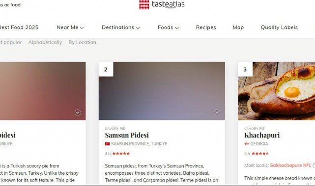 'Dünyanın En İyi Yemekleri Listesi'nde 'En İyi Turtalar' kategorisinde ilk 2 sırayı Samsun'a ait lezzetler paylaştı. Gastronomi dünyasının önemli kaynaklarından biri olan Taste Atlas'ın en iyi turtalar listesinde ilk sırayı Çarşamba pidesi, ikinci sırayı ise Samsun pidesi aldı. Dünyanın En İyi Yemekleri Listesi'nde 'Top 100 Pies in the World' (Dünyanın en iyi 100 turtası) listesinde ilk 2 sırayı paylaşan Çarşamba ve Samsun pidelerini sırasıyla Gürcistan'ın haçapurisi, Lüblan'ın sfihası, Gürcistan'ın ajaruli khachapurisi, Bosna-Hersek'in kljukusası, Gürcistan'ın guruli khachapurisi, Hollanda'nın appeltaartı, Fas'ın pastillası ve Şili'nin pastel de choclosu takip etti.