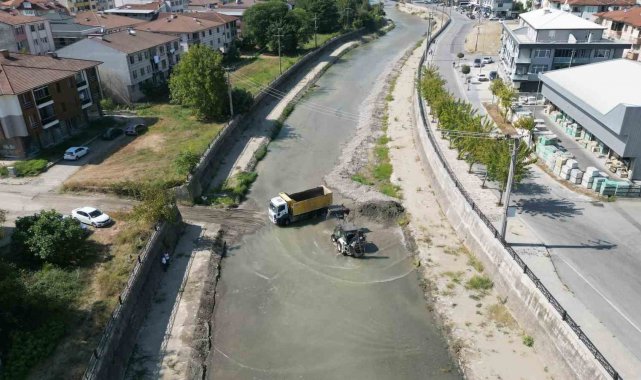 Düzce Belediyesi Temizlik İşleri Müdürlüğü, dere yüzeyinde ve etrafında oluşan tabakanın yanı sıra mevsimsel yağışlardan kaynaklı dere tabanında biriken atıklar kaldırılarak temizlenmesine yönelik çalışmaları sürüyor