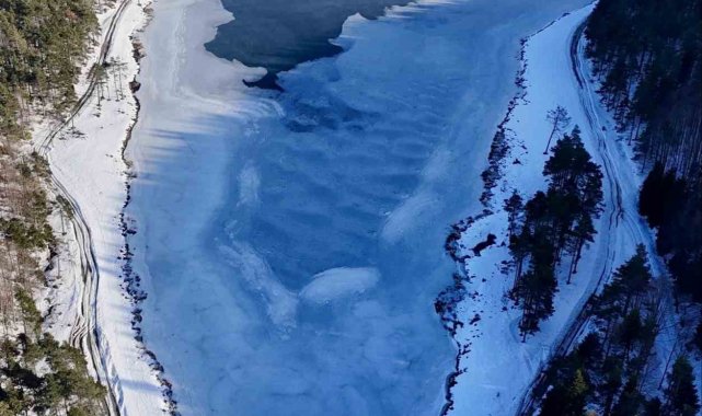 Kar yağışının ardından beyaza bürünen yayla ve donan göletin oluşturduğu manzara, dron ile havadan görüntülendi. Bölgede soğuk havanın etkisini sürdürmesi bekleniyor.