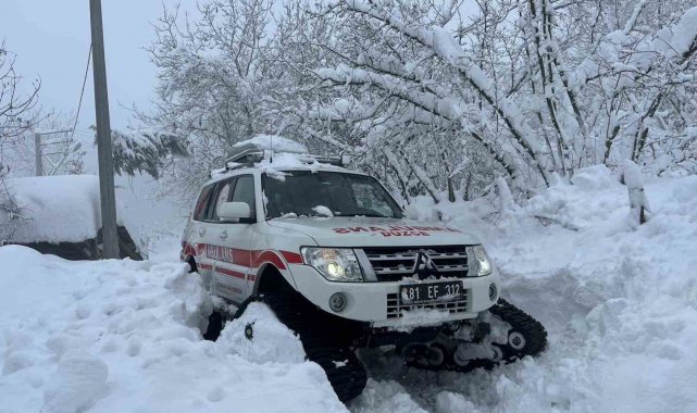Düzce'de yüksek kesimlerde etkili olan kar yağışı Yığılca'ya bağlı Tuğrul köyünde yolları kapattı. Köyde yaşayan 95 yaşındaki hastanın yardımına ise paletli ambulans yetişti.