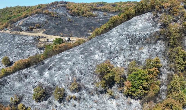 Düzce'de ormanlık alanda dün başlayıp 9 saatte kontrol altına alınan yangının hasarı havadan görüntülendi. Bölgede hasar tespitine başlandı.