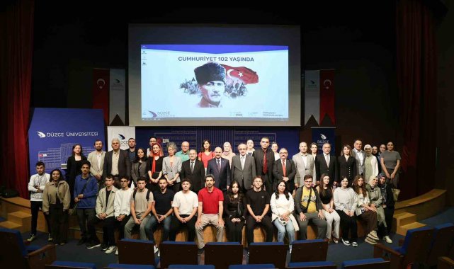 Düzce Üniversitesi Fen Edebiyat Fakültesi Tarih Bölümü'nce, 29 Ekim Cumhuriyet Bayramı kapsamında "Cumhuriyet 102 Yaşında" başlıklı program düzenlendi. Cumhuriyet Konferans Salonu'nda yoğun katılımla gerçekleşen programa; Düzce Üniversitesi Rektörü Prof. Dr. Nedim Sözbir, Rektör Yardımcıları Prof. Dr. İlhan Genç ve Prof. Dr. Ali Öztürk, Düzce Üniversitesi Dekanları, akademik ve idari personel ile öğrenciler katıldı.