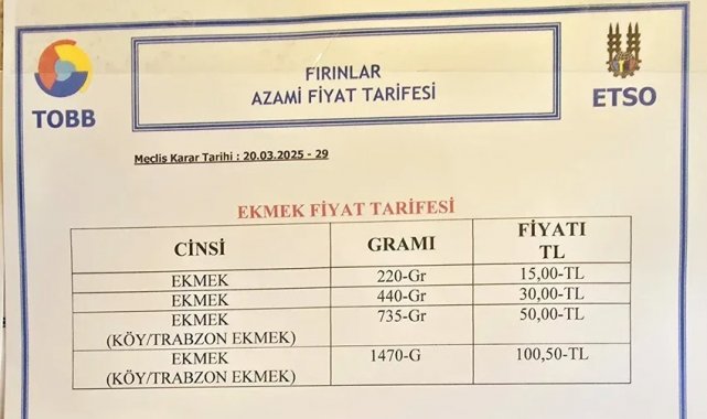 Edirne Ticaret ve Sanayi Odası'nın zam talebi, bakanlık tarafından onaylandı. Edirne'de 220 gram ekmek 15 TL'den fırınlarda satışa başlandı. 2025 yılı için geçerli olacak asgari ücretin açıklanmasının ardından, ekmek fiyatlarına yapılacak zam merakla bekleniyordu. Edirne dışında birçok ilde ekmek fiyatına zam gelmişti. ETSO'nun üyelerinin istediği zammın onaylanması ile beraber Edirne'de 220 gram ekmek 10 TL'den 15 TL'ye yükseldi.