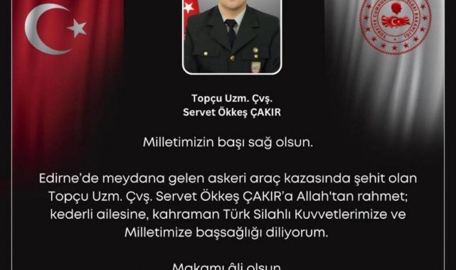 Edirne'nin Uzunköprü ilçesindeki 102'nci Topçu Alay Komutanlığı'nda görev yapan Topçu Uzman Çavuş Servet Ökkeş Çakır, askeri araç bakımı sırasında geçirdiği kazada ağır yaralanarak şehit oldu. Çakır'ın naaşı, görev yaptığı topraklarda düzenlenen törenin ardından memleketi Osmaniye'ye dualarla uğurlandı.
