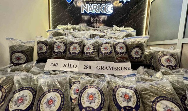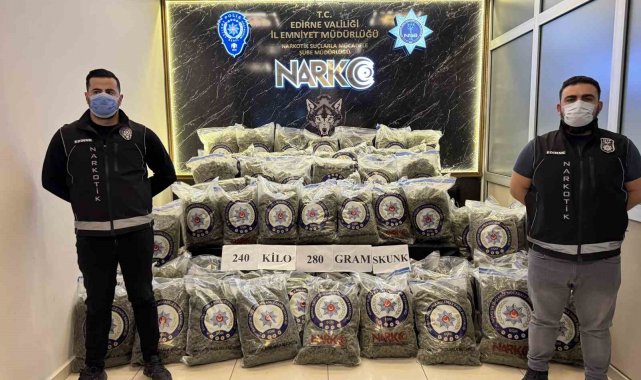 Edirne'de bir tırda ele geçirilen 240 kilogram skunk, Narkotik Suçlarla Mücadele Şube Müdürlüğü'nde sergilendi.