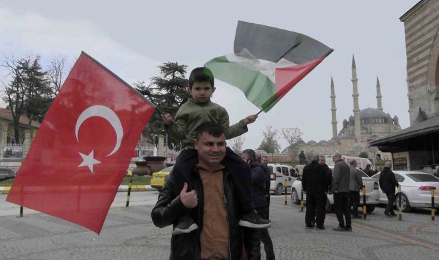 Edirne'de cuma namazı çıkışında Eski Cami önünde toplanan kalabalık, Filistin'e destek amacıyla basın açıklaması gerçekleştirdi.