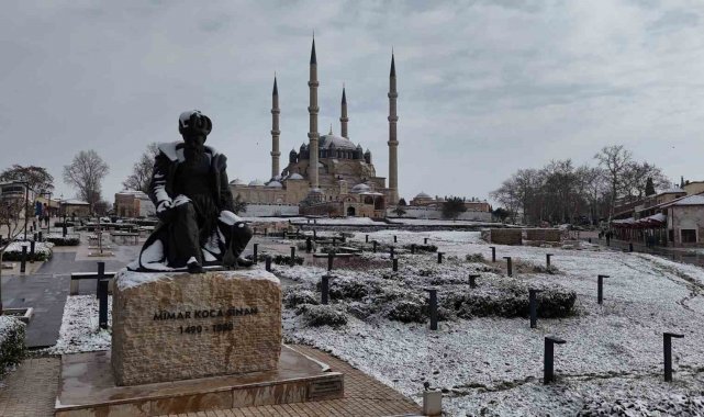 Edirne'de kar yağışıyla birlikte tarihi mekanlar beyaz örtüyle kaplandı. Kar altındaki Mimar Sinan'ın ustalık eseri Selimiye Camii ve kentin tarihi bölgesi Karaağaç, kartpostallık görüntüler oluşturdu.