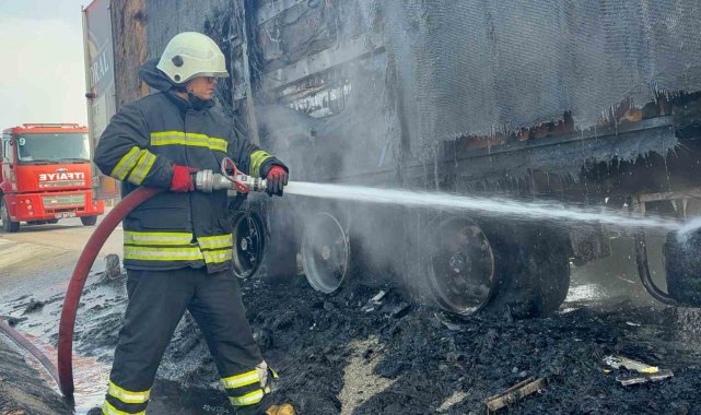 Edirne'de limon yüklü tırın alev alması sonucu meydana gelen yangında limonata yüklü tırın dorsesi kullanılamaz hale geldi.