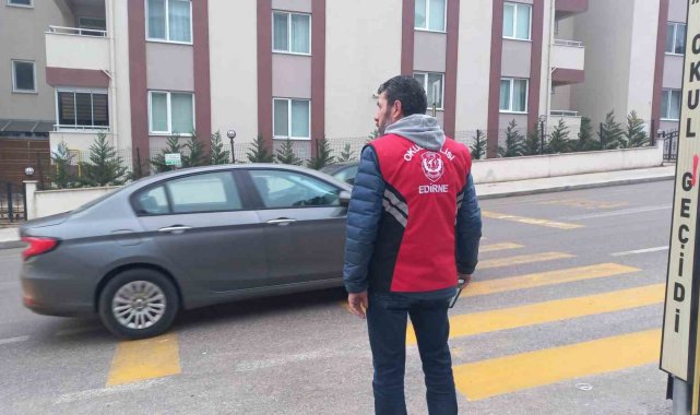 Edirne Emniyet Müdürlüğünün, kent merkezindeki okullarda öğrenciler sabah derse girmeden önce görevlendirdiği kırmızı yelekli "okul polisi" ekipleri, öğrencilerin bir yandan okullara girişlerini sağlarken diğer yandan da trafik akışını düzenliyor.