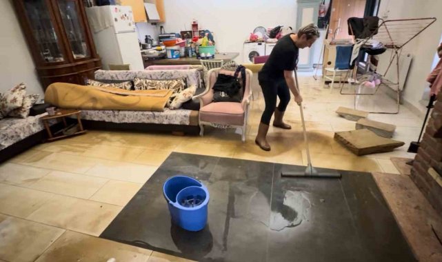 Edirne'de şiddetli sağanak nedeniyle rögarın taşması sonucu su basan evdeki eşyalar kullanılamaz hale geldi.