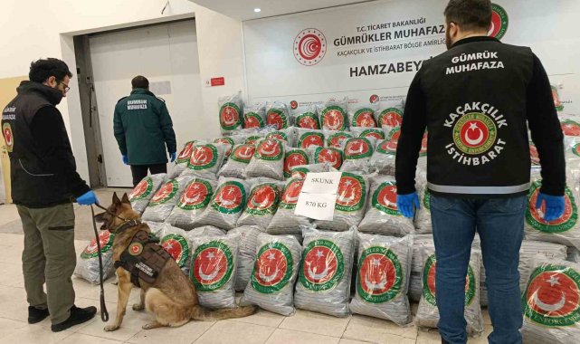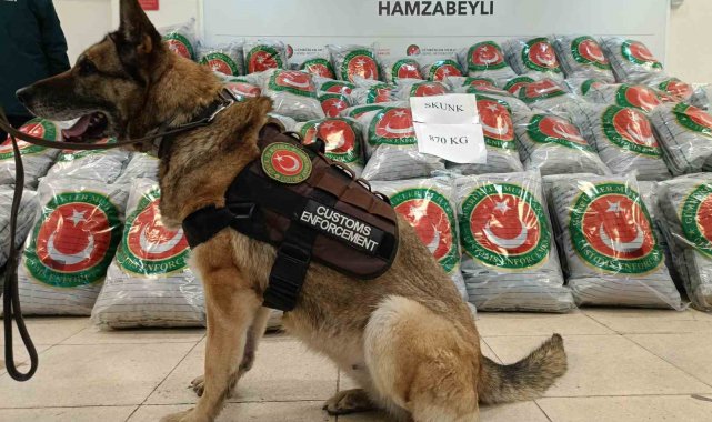 Alınan bilgiye göre, Gümrük Muhafaza Kaçakçılık ve İstihbarat Müdürlüğü ekiplerince, Hamzabeyli Sınır Kapısı'na gelen demir cevheri yüklü tır, şüphe üzerine durdurularak x-ray taramasına sevk edildi. Şüpheli yoğunluk tespit edilen araçta dedektör köpeklerle yapılan aramada yasal yükün içerisinde torbalar içerisine streçlenmiş vaziyette 870 kilogram skunk uyuşturucu madde ele geçirildi. Olayla ilgili 2 kişi gözaltına alındı. İşlemleri tamamlanarak adliyeye sevk edilen şüpheliler çıkarıldığı mahkemece tutuklandı.