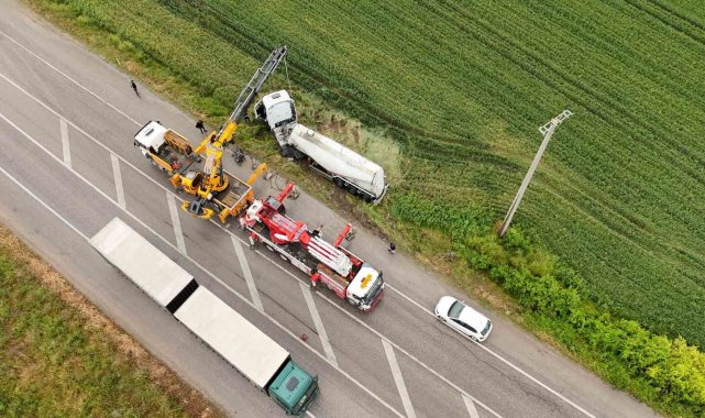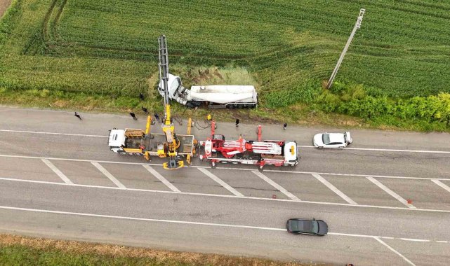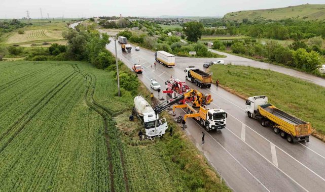 Tarlaya devrilen çimento dolu silobas treyler tır, olay yerine çağrılan vinçlerin yardımıyla kaldırıldı.