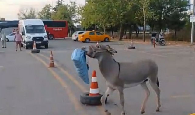 Edirne Otogarı'nda bir süredir görülen başıboş eşek, çevredeki malzemeleri ağzına alarak kaçmasıyla dikkat çekiyor. Daha önce dubayı çalıp vatandaşları peşinden koşturan eşek, bu kez sabaha karşı uyuyan otobüs şoförünün yastığını alıp uzaklaştı. Şoförün şortlarıyla eşeğin peşinden koştuğu anlar otogarda gülüşmelere neden oldu. Daha sonra yine otogara gelen eşek bu kez marketten ağzına aldığı çantayı çaldı. Başıboş eşeğin otogardaki ilginç maceraları cep telefonu kameralarına da yansıdı. Hayvana sahip çıkan taksi durağı esnafının, eşeği çay şekeriyle beslediği öğrenildi.