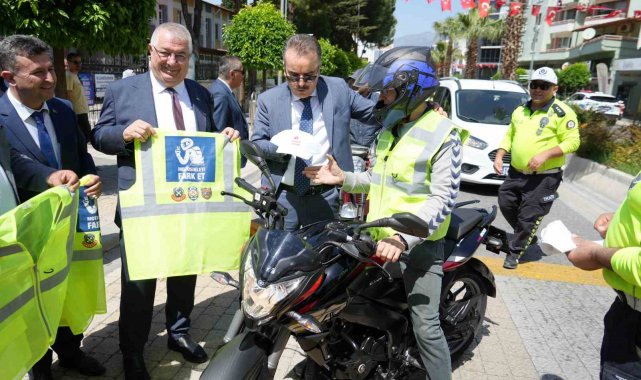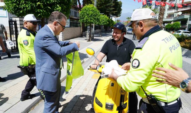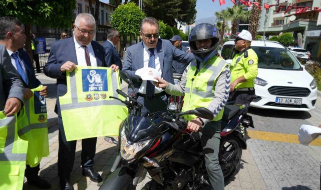 Balıkesir'in Edremit ilçesinde Trafik Haftası etkinlikleri kapsamında motosiklet sürücülerine reflektif yelek dağıtıldı.