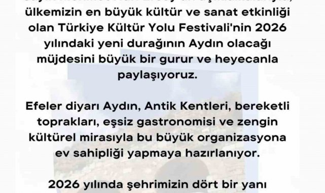 Yetkililer tarafından konuyla ilgili yapılan açıklamada, "Kültür ve Turizm Bakanı Mehmet Nuri Ersoy'un açıklamalarıyla ülkemizin en büyük kültür ve sanat etkinliği olan Türkiye Kültür Yolu Festivali'nin 2026 yılında yeni durağının Aydın olacağı müjdesini büyük bir gurur ve heyecanla paylaşıyoruz. Efeler diyarı Aydın, antik kentleri, bereketli toprakları, eşsiz gastronomisi ve zengin kültür mirasıyla bu büyük organizasyona ev sahipliği yapmaya hazırlanıyor. 2026 yılında şehrimizin dört bir yanı konserler, sergiler, atölyeler ve birbirinden renkli etkinliklerle canlanacak. Bu önemli kararın şehrimize ve ülke turizmine hayırlı olmasını diliyor, başta Kültür ve Turizm Bakanımız Mehmet Nuri Ersoy olmak üzere emeği geçen herkese şükranlarımızı sunuyoruz" ifadelerine yer verildi.