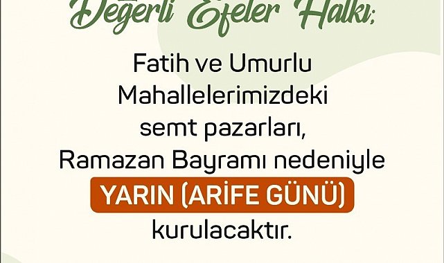 Normal şartlarda Cuma günü kurulan semt pazarları, hem halkın bayram öncesi hazırlıklarını tamamlaması hem de esnafın bayramı ailesiyle geçirebilmesi için bir gün öne çekildi. Buna göre, Fatih ve Umurlu Mahallelerindeki semt pazarları 19 Mart Perşembe (Arife) günü kurulacak.