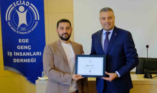 Seminerin sonunda, EGİAD'ın çevre duyarlılığını yansıtan anlamlı bir jestle, EGİAD Sakız Ağacı Korusu Projesi kapsamında Yavuz Kurt adına bağışlanan sakız fidanının sertifikası kendisine takdim edildi.