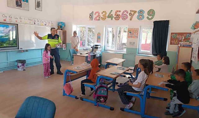 Isparta'nın Eğirdir ilçesine bağlı Tepeli Köyü İlkokulu'nda Jandarma Trafik Timi tarafından düzenlenen eğitimde 12 öğrenciye trafik kuralları anlatıldı.