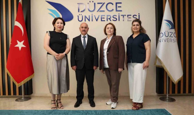 Düzce Üniversitesi'nin uluslararası iş birliği ortaklarından West Kazakhstan Marat Ospanov Medical University Rektör Yardımcısı Doç. Dr. Nurgül Abenova ve Uluslararası Koordinatör Tolkyn Bissenova, Düzce Üniversitesi Rektörü Prof. Dr. Nedim Sözbir'i makamında ziyaret etti.