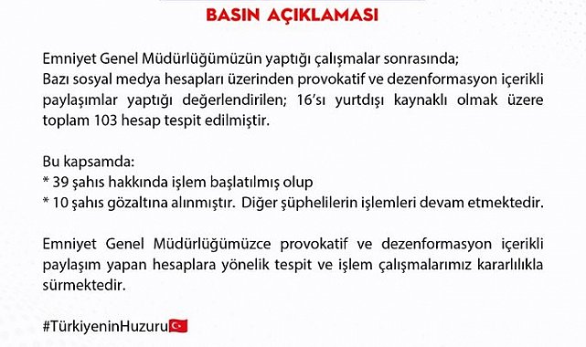 "Emniyet Genel Müdürlüğümüzün yaptığı çalışmalar sonrasında; bazı sosyal medya hesapları üzerinden provokatif ve dezenformasyon içerikli paylaşımlar yaptığı değerlendirilen; 16'sı yurtdışı kaynaklı olmak üzere toplam 103 hesap tespit edilmiştir. Bu kapsamda, 39 şahıs hakkında işlem başlatılmış olup, 10 şahıs gözaltına alınmıştır. Diğer şüphelilerin işlemleri devam etmektedir. Emniyet Genel Müdürlüğümüzce provokatif ve dezenformasyon içerikli paylaşım yapan hesaplara yönelik tespit ve işlem çalışmalarımız kararlılıkla sürmektedir."