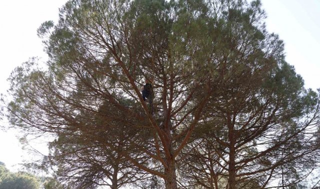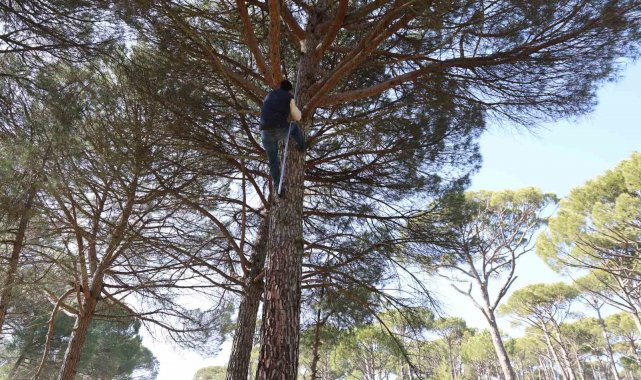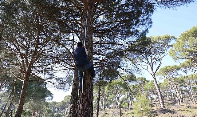 Son yıllarda Aydın'da dağlık alanlarda sıkça dikilip yetiştirilmeye başlanan çam fıstığı hem çiftçilerin hem de çalışanların yüzünü güldürüyor. Toptan olarak kilosu 3 bin TL'den satılan fıstık çamlarının bir tek kozalağı bile altın değerinde olurken yaklaşık 30-35 metre yüksekliğe sahip çam ağaçlarının tepesinde bulunan kozalakları toplamak da oldukça zor ve tehlikeli. İşçilerin maharetli bir şekilde metrelerce yükseklikteki ağaçlara tırmanışları ise görenleri şaşırtıyor. Adeta bir komando gibi ağaçlara rahat bir şekilde çıkan ve üzerinde gezinen işçiler, tehlikeli olsa da işini severek yapıyor.