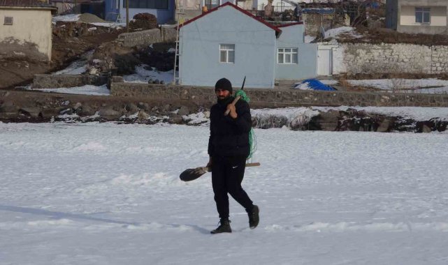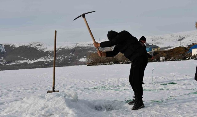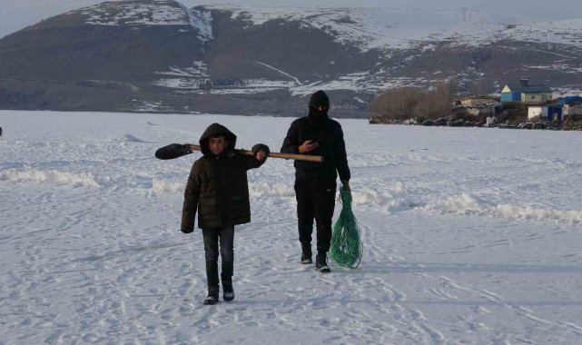 Doğu Anadolu'da 124 kilometrekare alanıyla bölgenin ikinci büyük gölü olan Çıldır Gölü'nün yüzeyi tamamen buz tuttu. Buz tutan gölde balıkçılar 'Eskimo usulü' ile balık avlıyor.