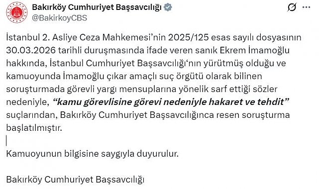 Bakırköy Cumhuriyet Başsavcılığı tarafından yapılan açıklamada, " İstanbul İstanbul 2. Asliye Ceza Mahkemesi'nin 2025/125 esas sayılı dosyasının 30.03.2026 tarihli duruşmasında ifade veren sanık Ekrem İmamoğlu hakkında, İstanbul Cumhuriyet Başsavcılığı'nın yürütmüş olduğu ve kamuoyunda İmamoğlu çıkar amaçlı suç örgütü olarak bilinen soruşturmada görevli yargı mensuplarına yönelik sarf ettiği sözler nedeniyle , "kamu görevlisine görevi nedeniyle hakaret ve tehdit" suçlarından, Bakırköy Cumhuriyet Başsavcılığınca resen soruşturma başlatılmıştır.