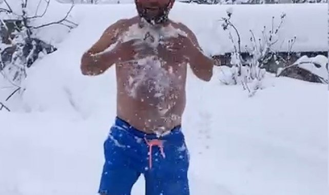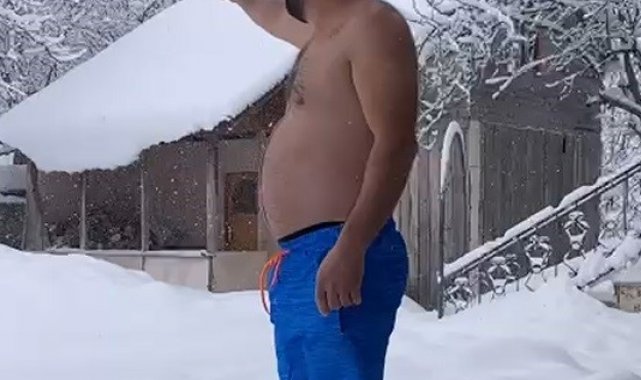 Eksi 10 dereceyi aldırmadan şortuyla karda yüzdü